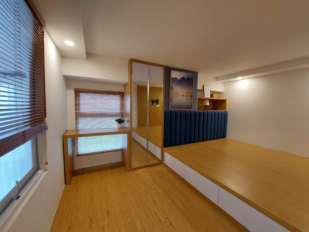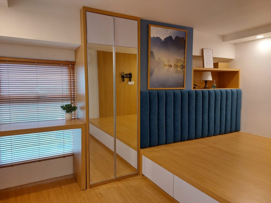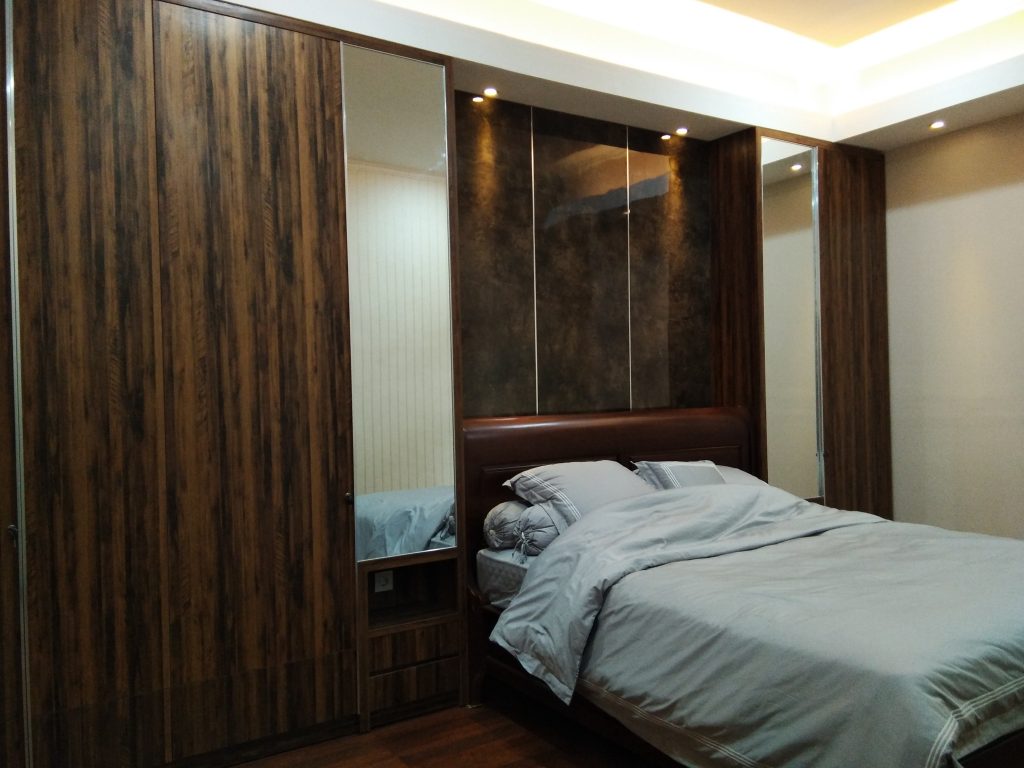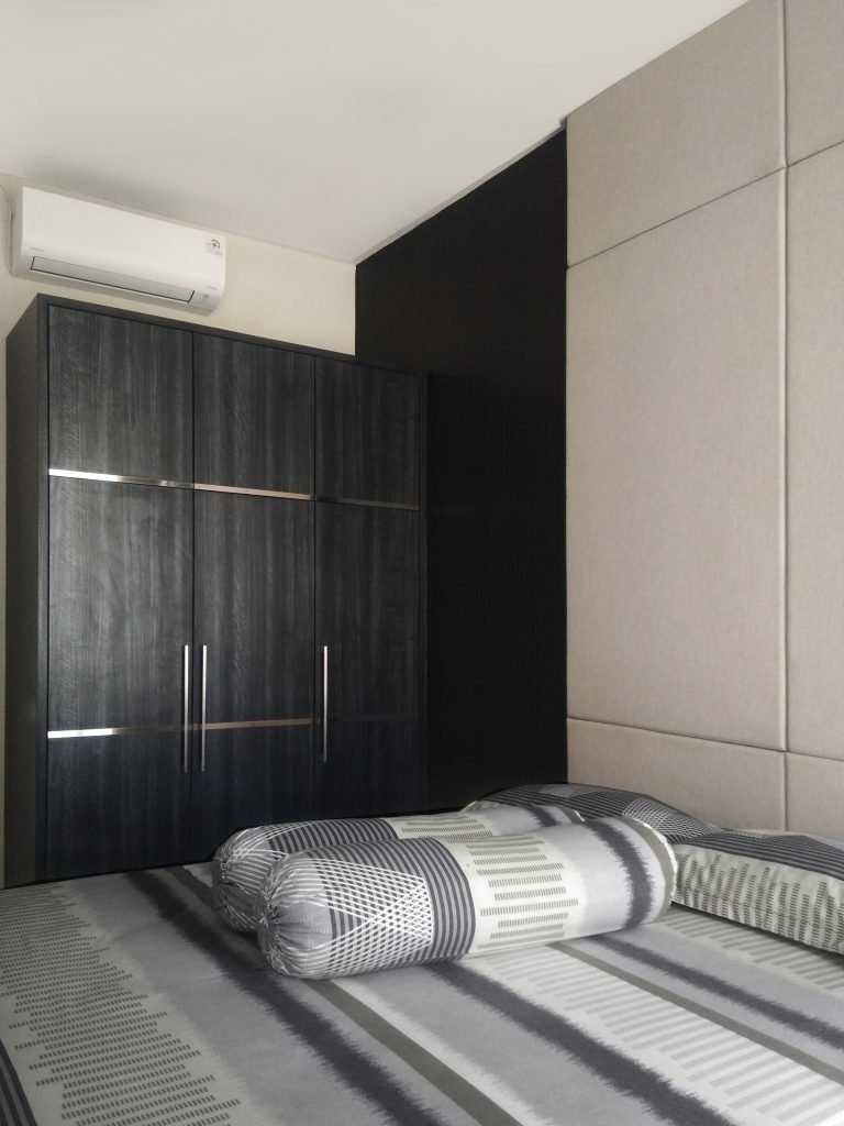 Interior dengan permintaan user merubah ruangan yang tidak terpakai menjadi ruang kamar tidur yang elegan. Agar sesuai konsep maka lantai yang keramik kusam diganti dengan menempel lantai parket kayu, merubah plafon menjadi model dropceiling, mengganti posisi elektrikal untuk support pencahayaan yang mendukung suasana ruangan, dan pekerjaan meubelair sesuai desain interior yang sudah disepakati dari hasil konsultasi dengan user.