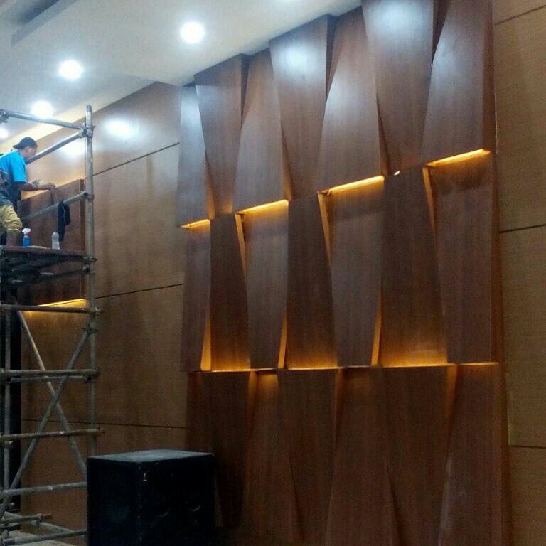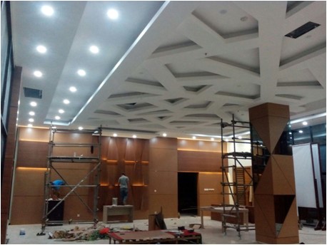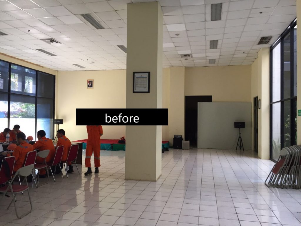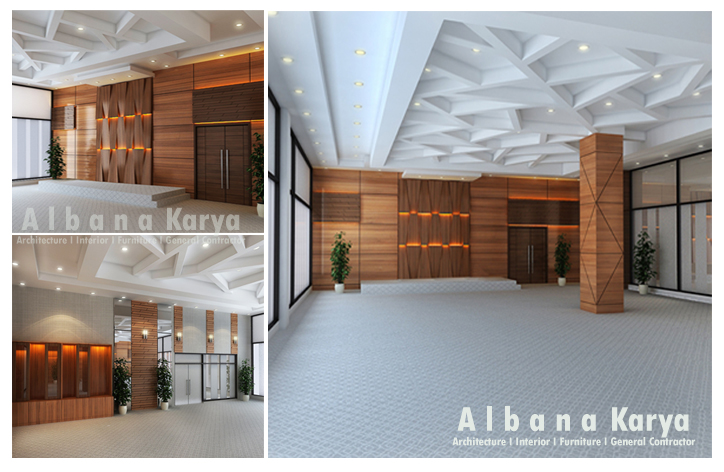 Pekerjaan interior ruang aula ini didesain dengan konsep pertemuan dibawah ranting pohon,alasan dibuat konsep seperti itu karena ada kolom besar ditengah ruangan, pekerjaan meliputi mainan plafon, mebel,cutting stiker,pencahayaan lampu,panggung dan assesoris lainnya.