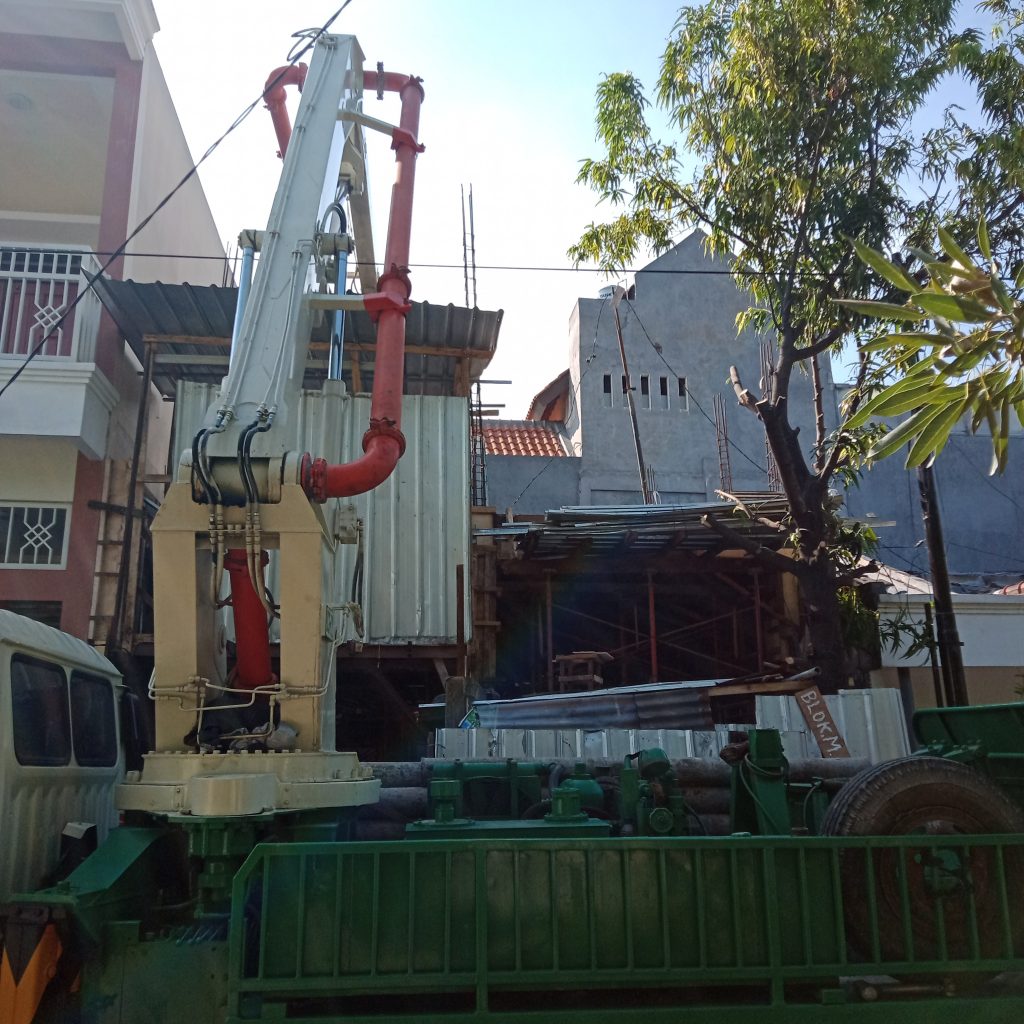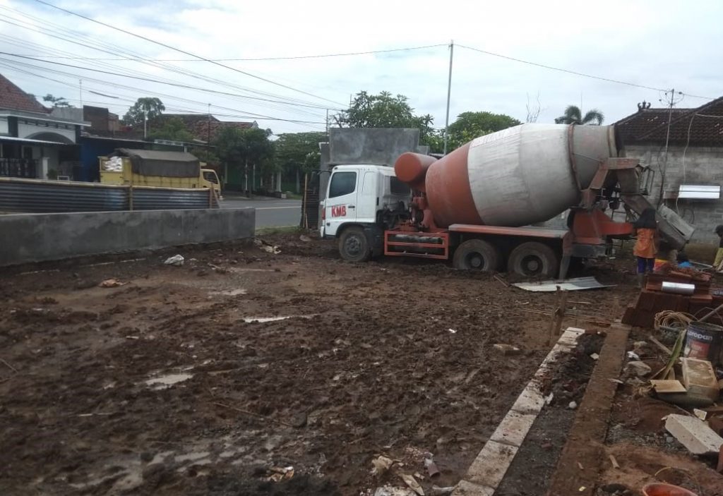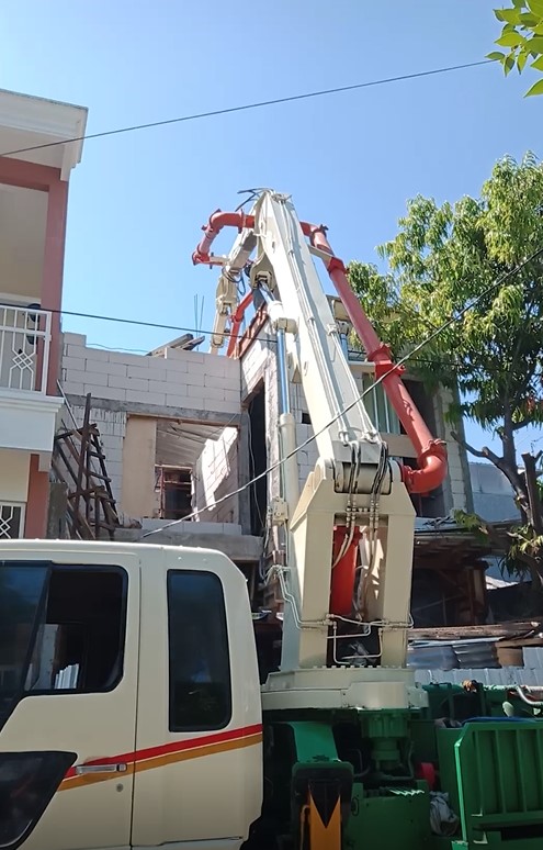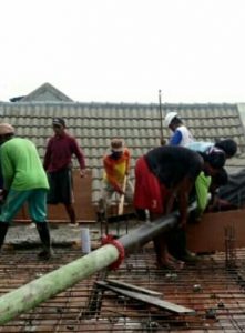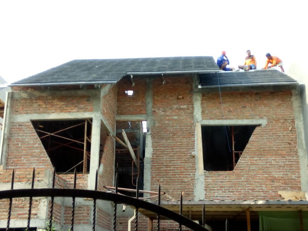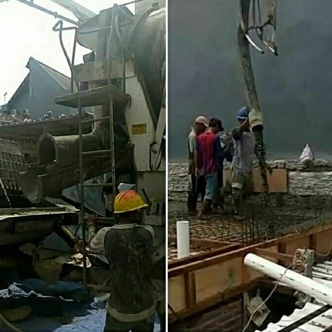 PROSES PEMBANGUNAN Pengecoran dak lantai dan balok kebiasaan albanakarya selalu menggunakan readymix dengan pompa beton agar mendapatkan hasil beton yang sesuai. pengalaman yang pernah dikerjakan digraha gununganyar ini karena jalan tidak memungkinkan masuknya kendaraan pompa maka terpaksa sewa pipa pompa 50meter, disini suatu pengalaman yang harus mengkondisikan tidak mengganggu warga sekitar, bagaimanapun kita melakukan pembangunan di padat pemukiman standar albanakarya selalu menjaga ketertiban,kebersihan dan keamanan sekitar lokasi pembangunan. disini desain fasad tanpa kanopi, ini berhubung ada kanopi teras menyebabkan fasad depan berubah tampilan.