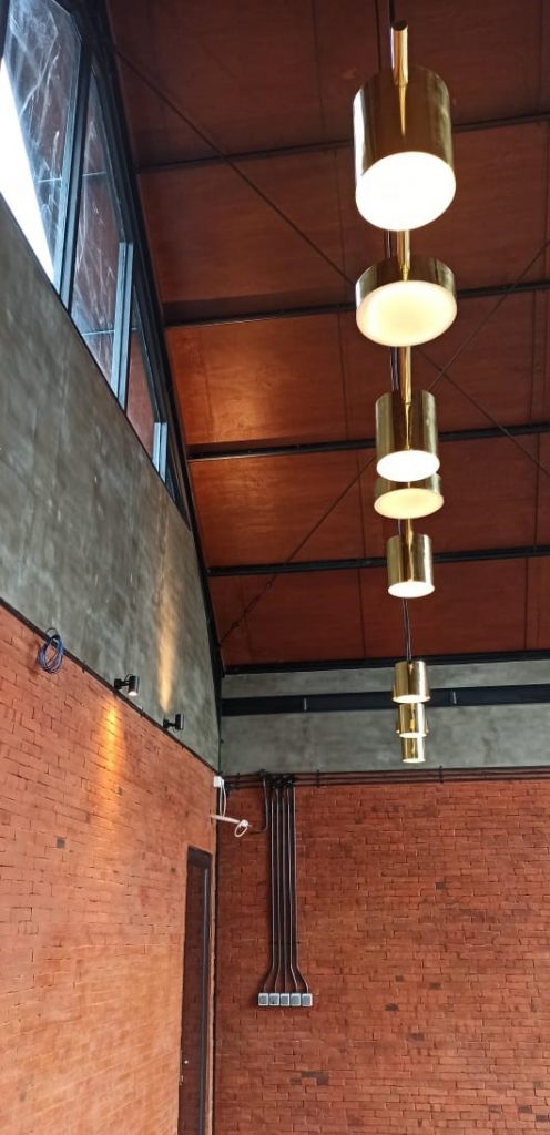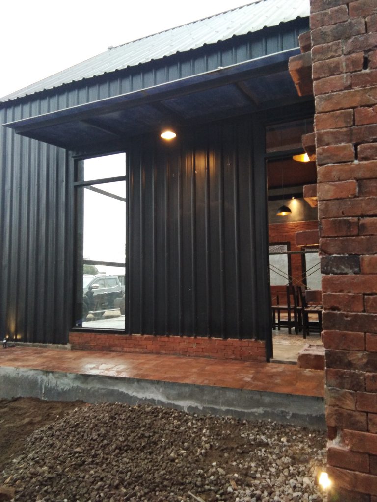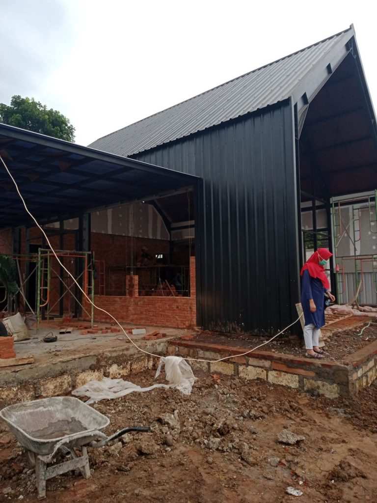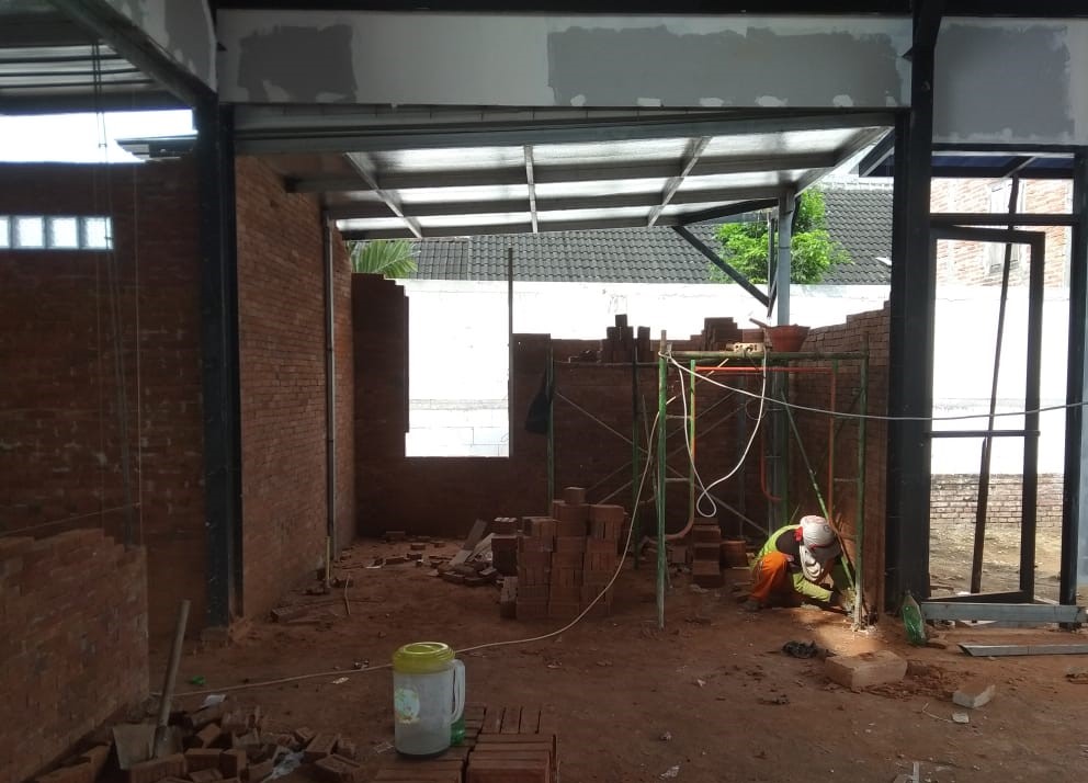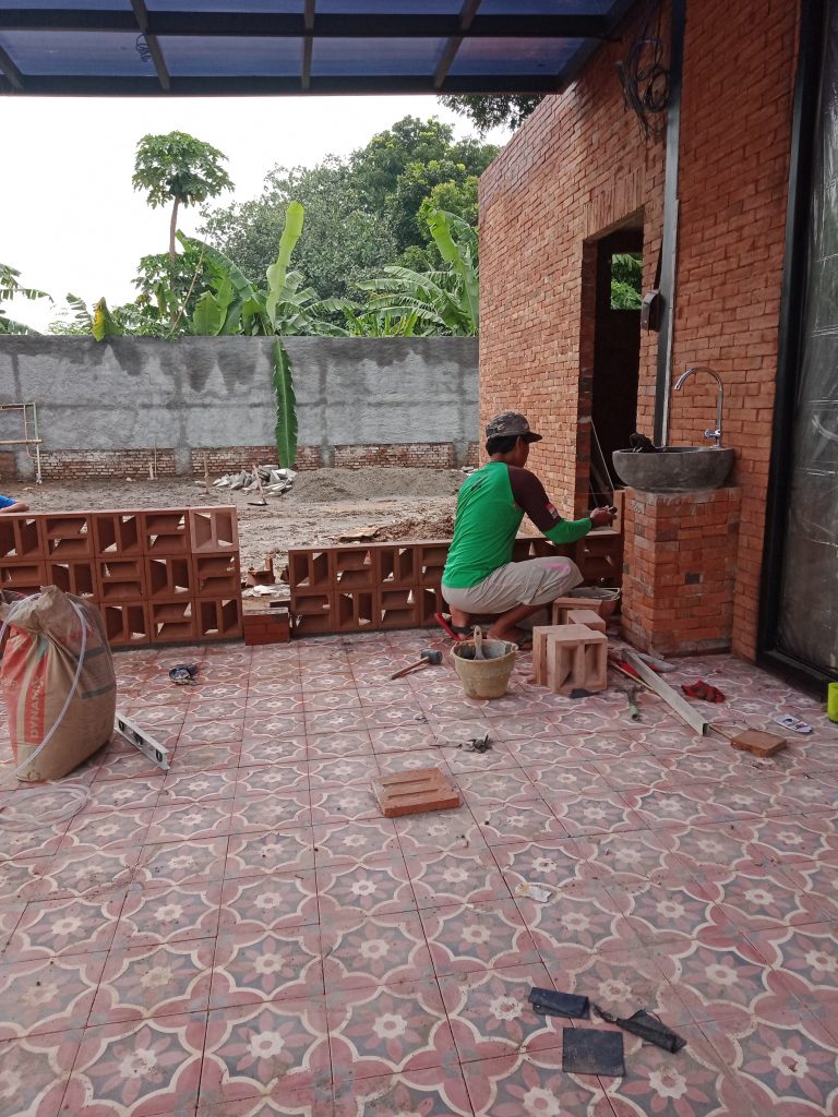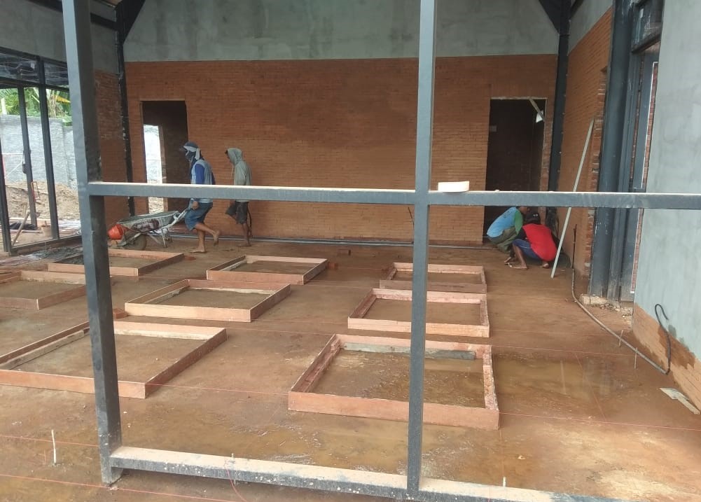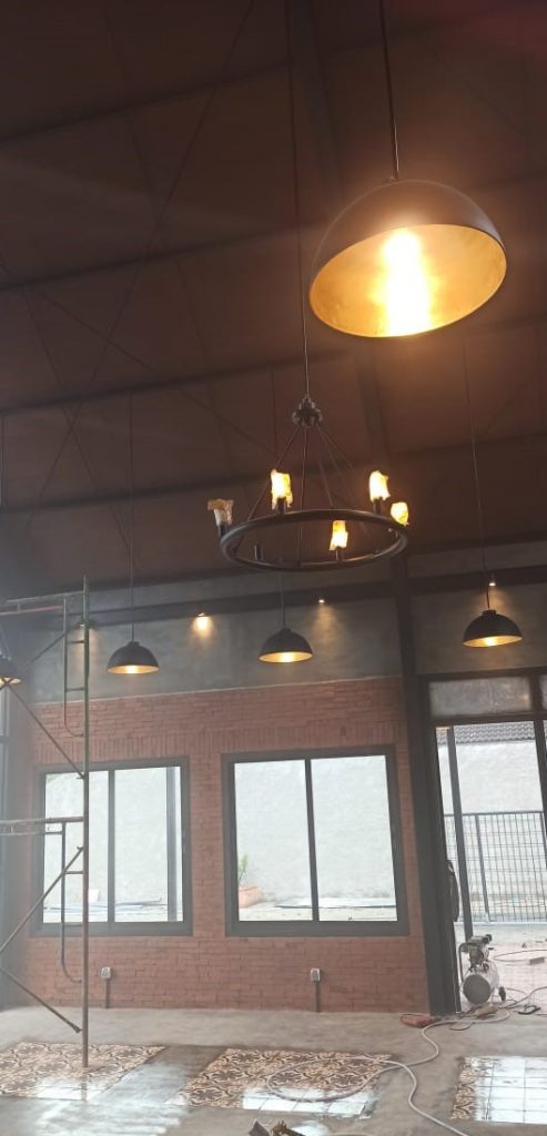 PROSES PEMBANGUNAN Perpaduan material dinding batamerah MRH,Spandek galvalum,Semen mortar dengan konsep expose, Lantai semen beton, Lantai tegel, Lantai batamerah dan Instalasi listrik expose serta lampu custom handmade kuningan.