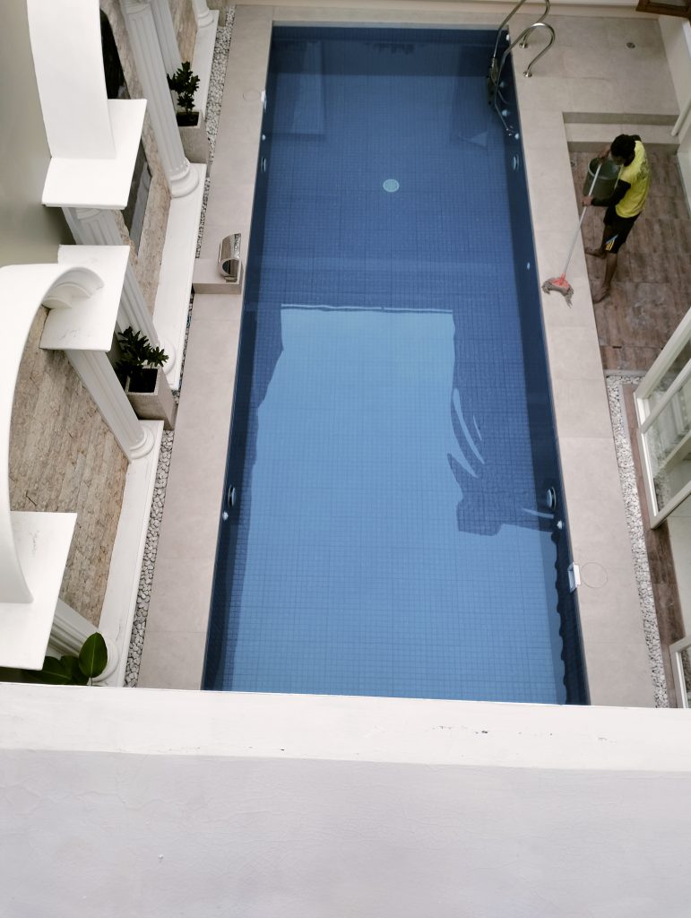 Pembangunan kolam renang memanfaatkan lahan belakang rumah yang awalnya sebagia lahan taman, klien kami ingin mewujudkan didalam rumah ada fasilitas olahraga renang dan tempat berkumpul santai sama keluarga.